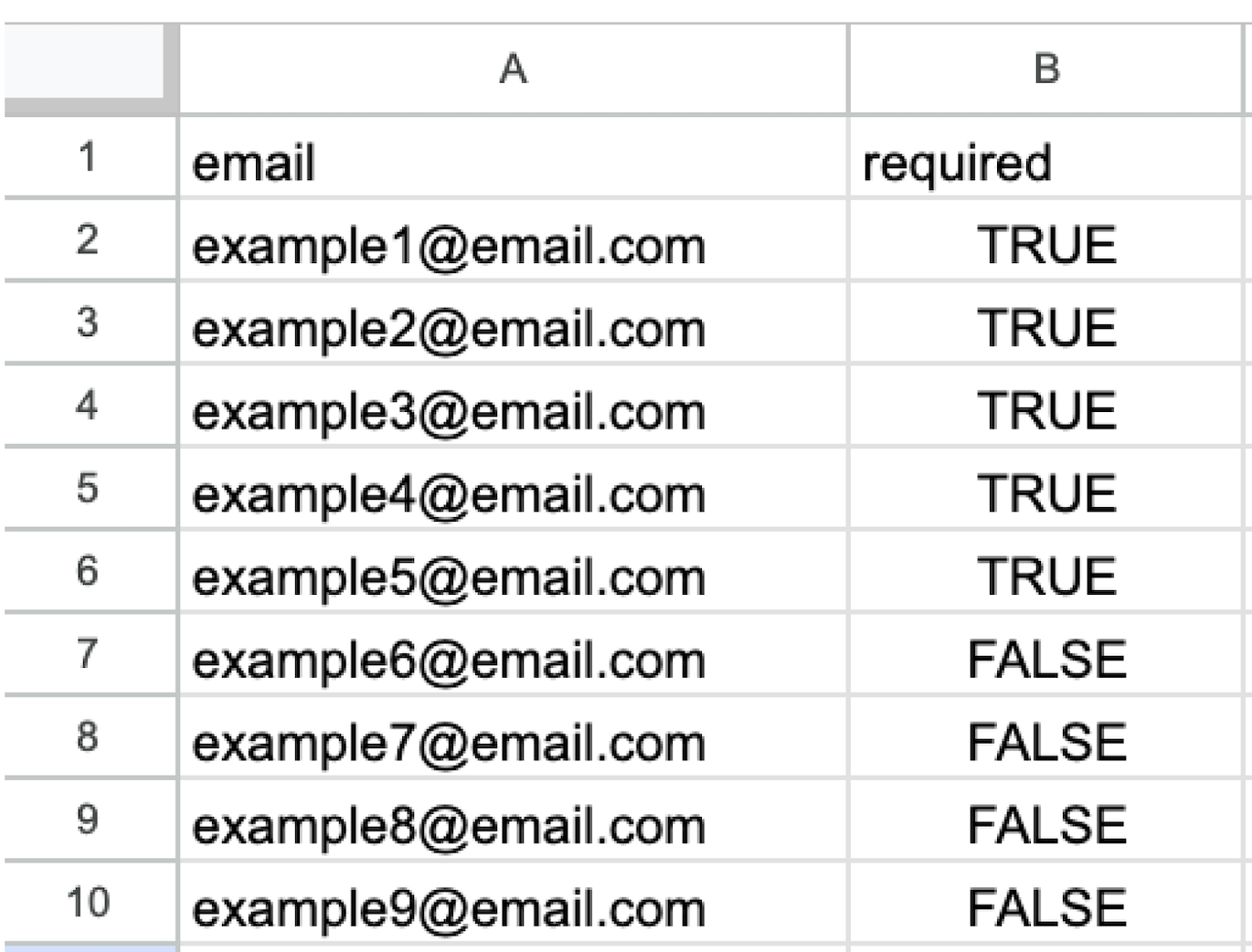 - For learners you want to invite as 'Required', insert "TRUE" in column B.