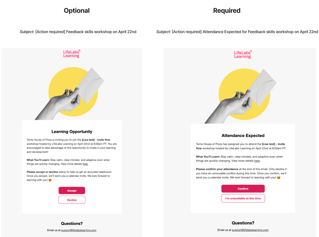 Yes. You can remind learners to respond to an invite for a specific event by clicking into the event and then selecting 'Resend [required/optional] invite' from the dropdown ellipsis on the right side of the row for that specific learner. This will trigger the exact same email as the originally sent email. See example email copy above in this article.