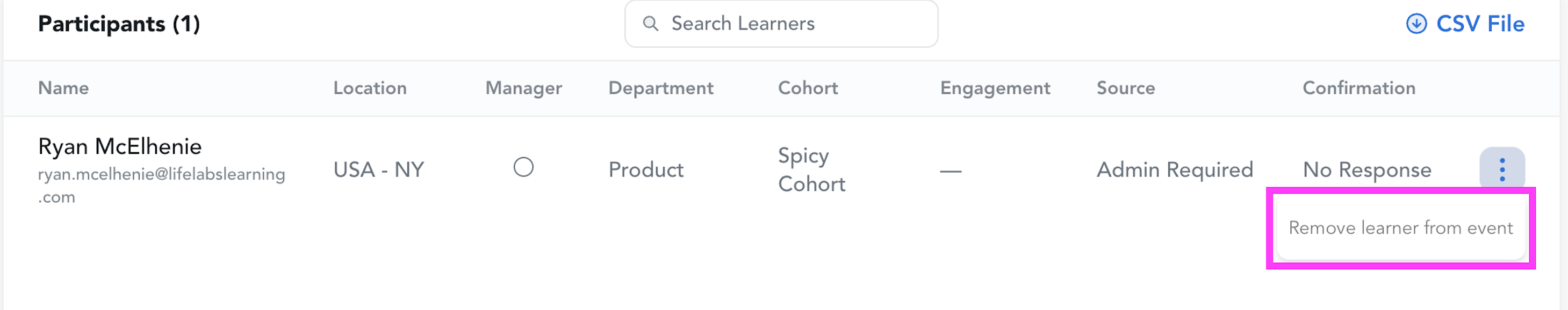 (3) Click the vertical ellipsis for the relevant learner on the right side of the page and select "Remove learner from event".
