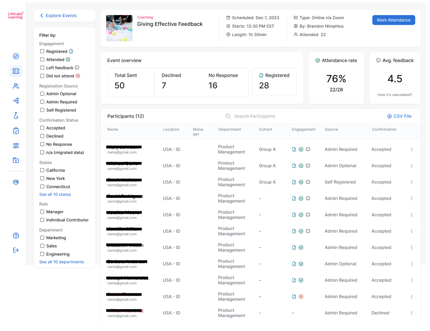 Click on an event to see a detailed breakdown of registration and attendance data for that specific event.