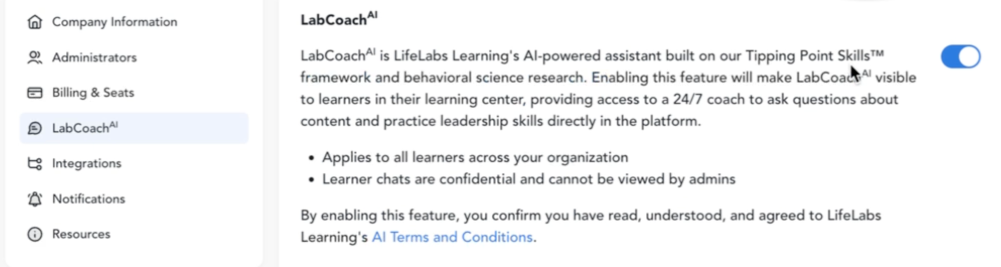 LabCoachᴬᴵ is available as a paid add-on feature for our partners purchasing Membership and Team Training via SOW. The feature will be disabled by default, with Admins in control of manually toggling it on or off at their discretion. Please reach out to your LifeLabs Learning Consultant to discuss adding on the LabCoachᴬᴵ feature!